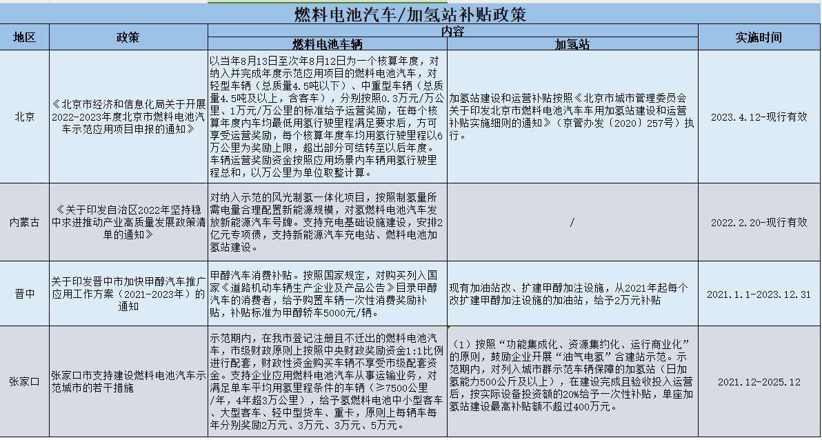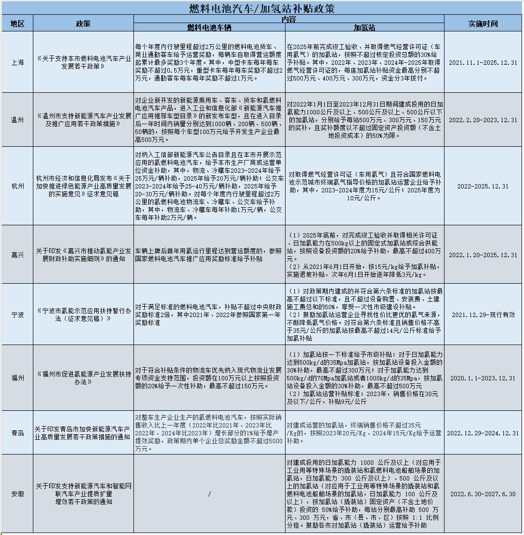 隨著氫燃料電池產(chǎn)業(yè)鏈的不斷完善,疊加各省市政策的引導(dǎo),我國的氫能及燃料電池產(chǎn)業(yè)發(fā)展十分迅速。以下是我司整理匯總的各省市現(xiàn)行有效的燃料電池車/加氫站補(bǔ)貼政策: