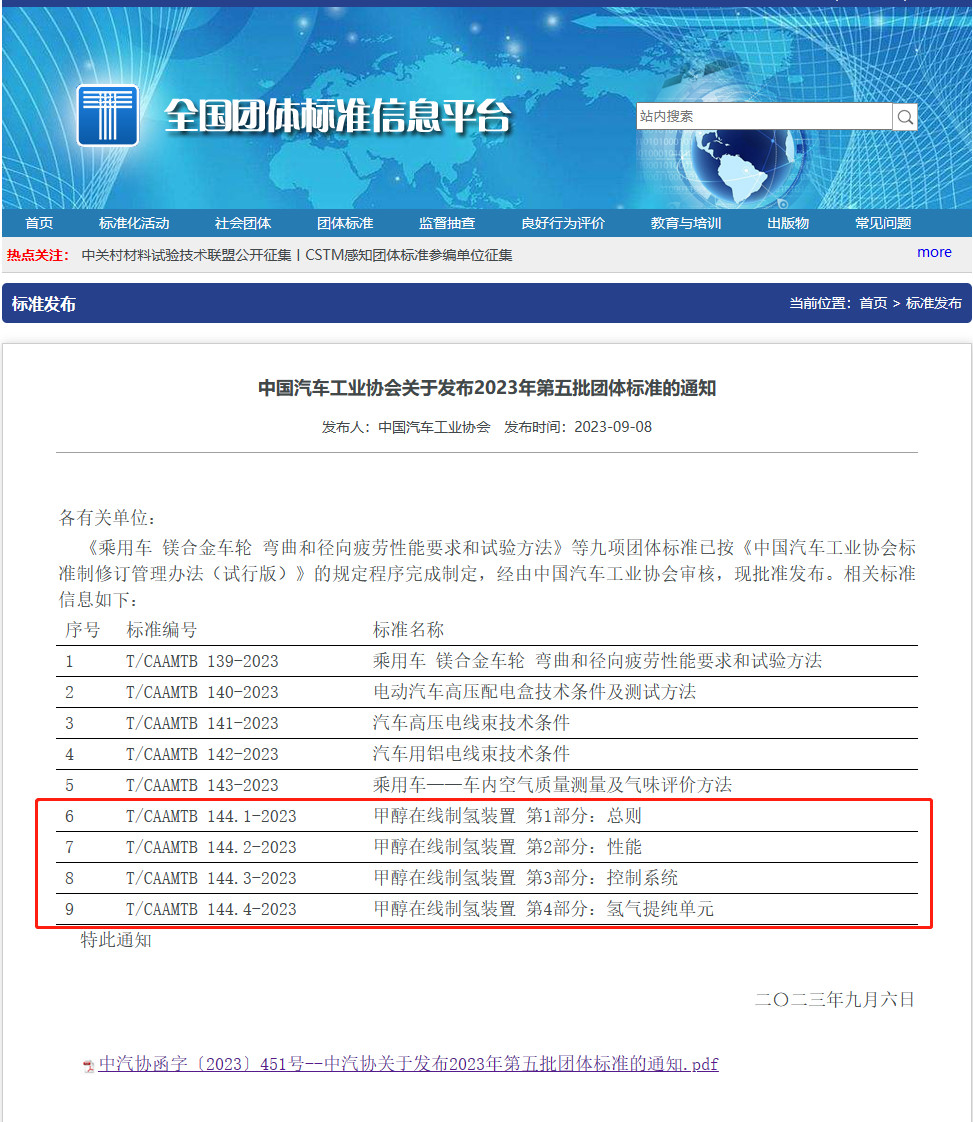 Recently, Co-Win Hydrogen Power (Guangdong) co., Ltd. (hereinafter referred to as the "company") led by China shipping group co., Ltd., faw liberation co., Ltd., and other enterprises develop group standards (hereinafter referred to as "standard") "methanol online hydrogen production device part 1: general principles, the" methanol online hydrogen production device, part 2: performance "the methanol online hydrogen production device part 3: control system" the methanol online hydrogen production device part 4: hydrogen purification unit has been officially announced by the China association of automobile industry, The standard guides the manufacture, control and operation of methanol on-line hydrogen production unit, It is of great significance to promote the development and construction of the automobile industry (especially the hydrogen automobile) industry.